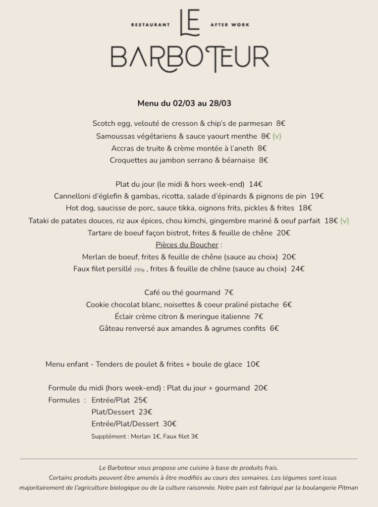 Au Barboteur, nous aimons vous faire découvrir de nouvelles saveurs et laisser libre cours à notre inspiration culinaire du moment. C’est pourquoi notre ambition est de vous proposer une carte qui évolue régulièrement, au fil des saisons et de nos envies. Notre objectif : vous faire plaisir avec de bons produits !